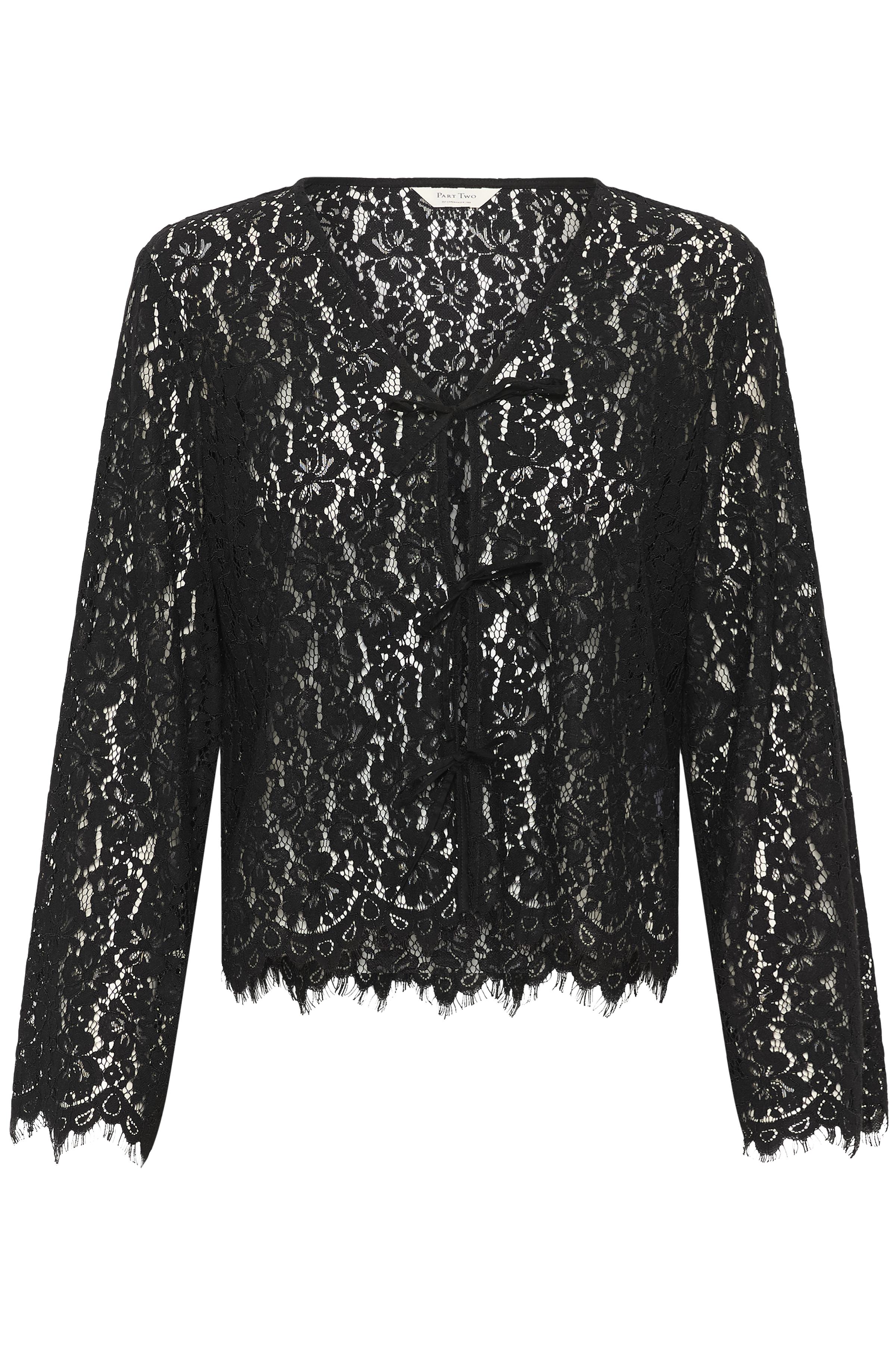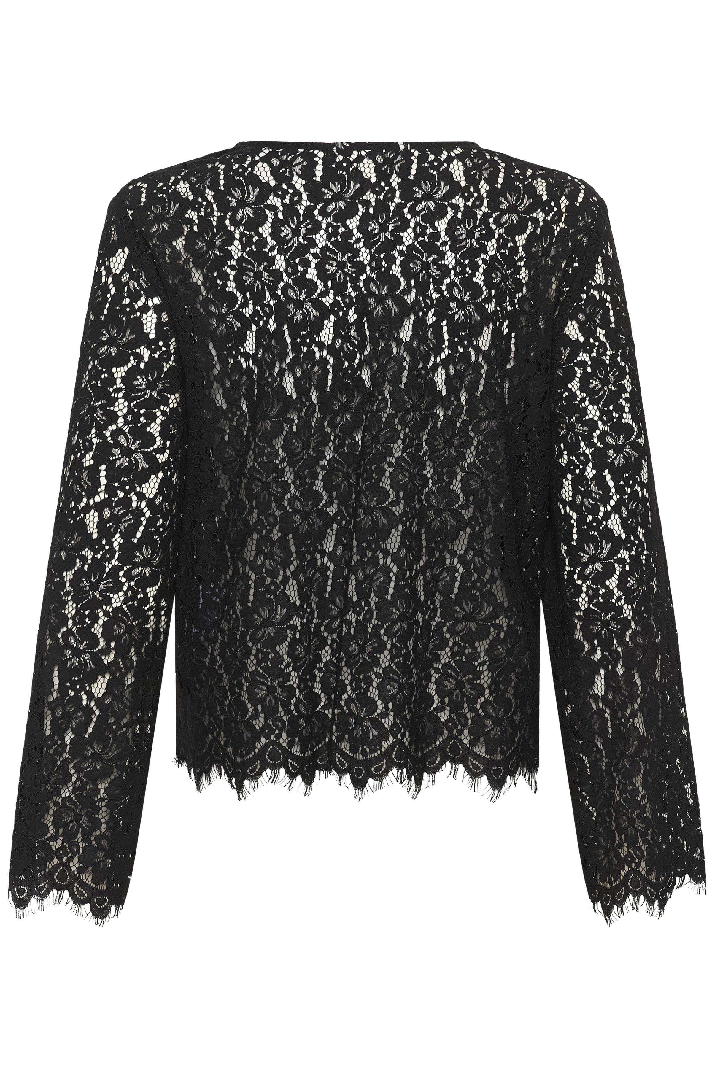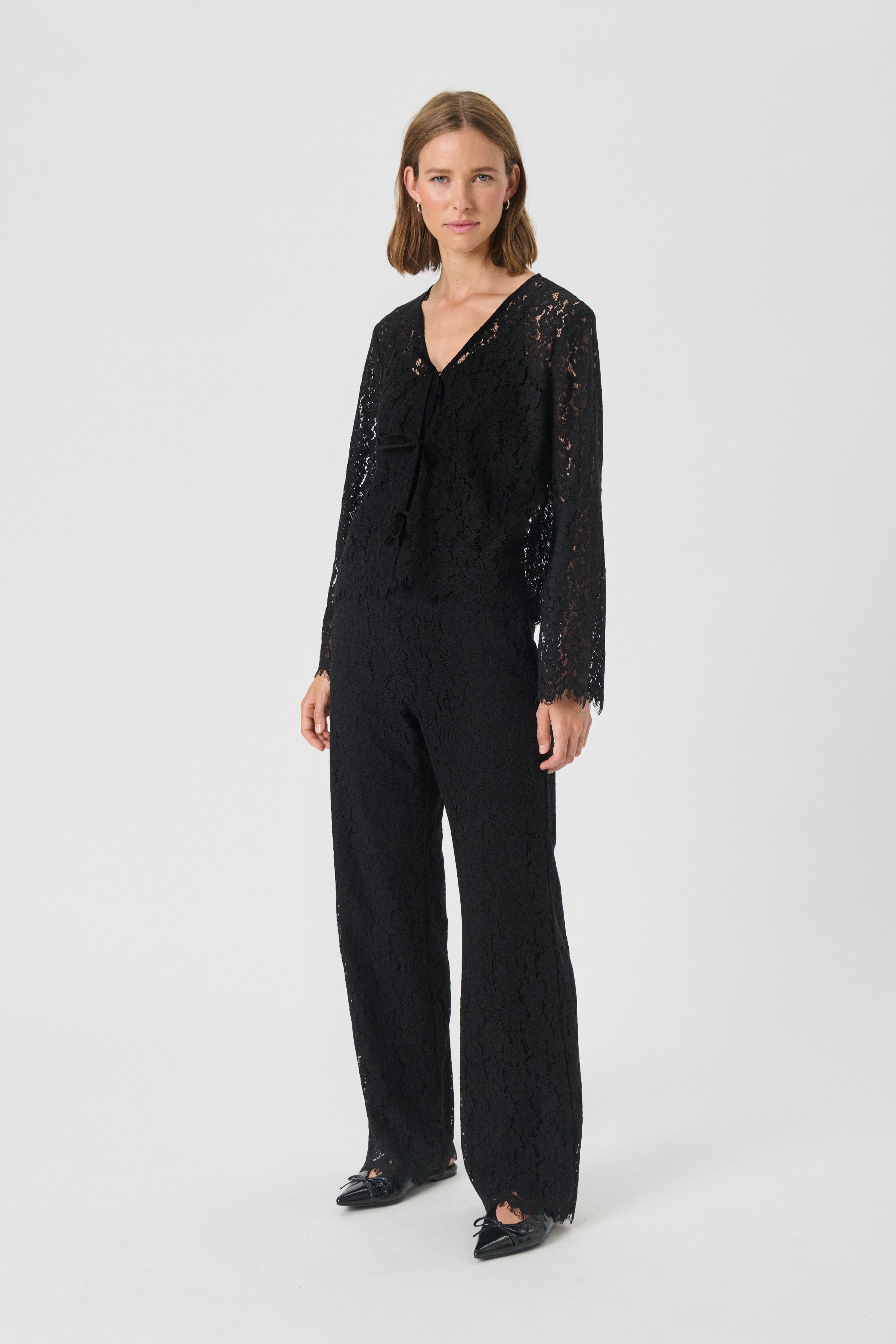 The model is 178 cm tall and wears a size 36. This elegant black lace blouse features a flattering V-neckline and delicate front tie closures. The long, semi-sheer sleeves and refined texture make it perfect for festive occasions or a stylish everyday look. Pair it with jeans or a matching skirt.