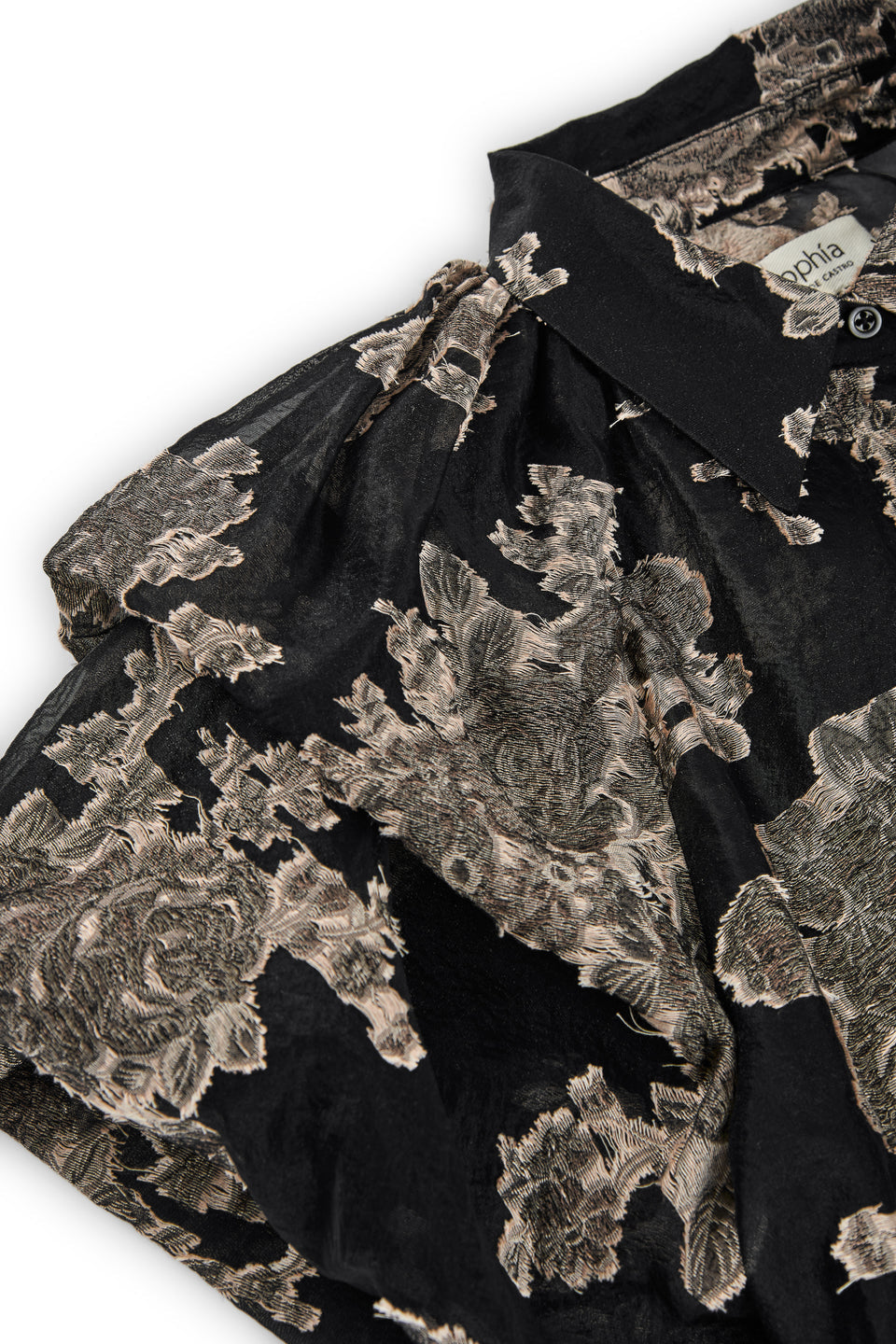 The shirt collar defines the neckline and balances the design, providing a clear base upon which the true protagonist unfolds: an abstract floral print in silver and gray tones on a black background. Far from being literal, the motif evokes references to Art Nouveau and classic ornamental design, with curved lines and visual rhythm, applied in relief on a lightweight technical fabric.