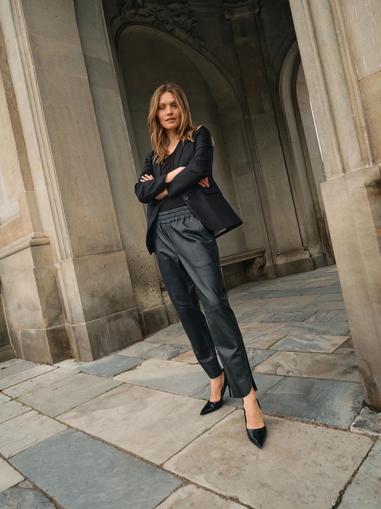 Looking for comfortable yet exclusive leather pants? Then these leather sweatpants might be something for you. They are designed in a loose fit with mid waist and pockets, finished with a curved slit at the hem. Wear with everything from classic shirts to flowy blouses and statement tees.