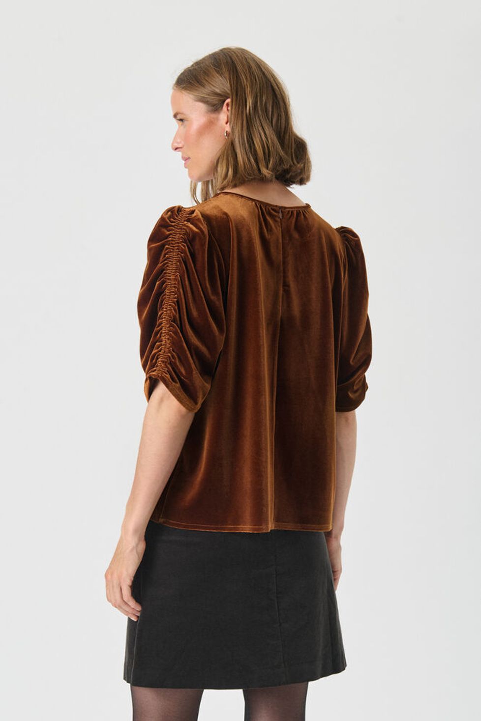 The model is 178 cm tall and wears a size 36. This blouse in deep green velvet has an elegant sheen and a relaxed fit. The short puff sleeves with delicate gathering add a feminine touch, while the round neckline creates a classic look. Style it with trousers for everyday wear or a skirt for festive occasions.